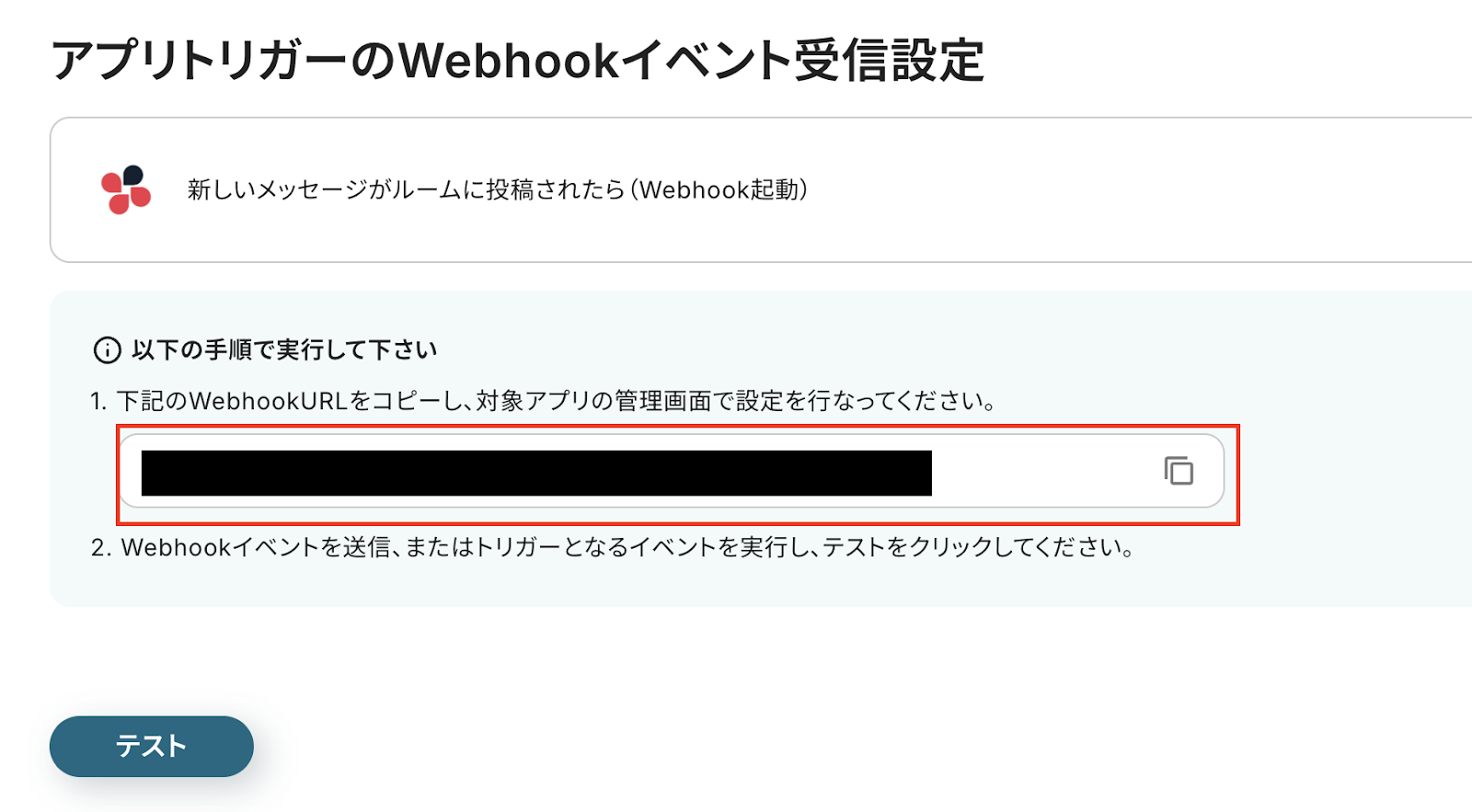 設定後、Chatworkでトリガーとなるイベント(新しいメッセージをルームに投稿)を実行し、テストをクリックしてください。