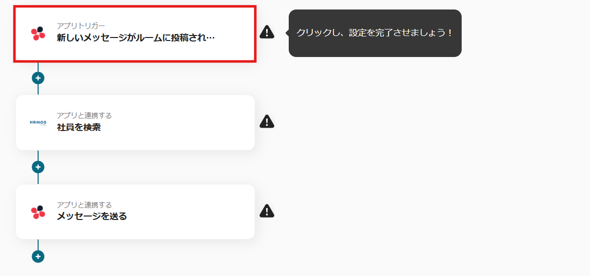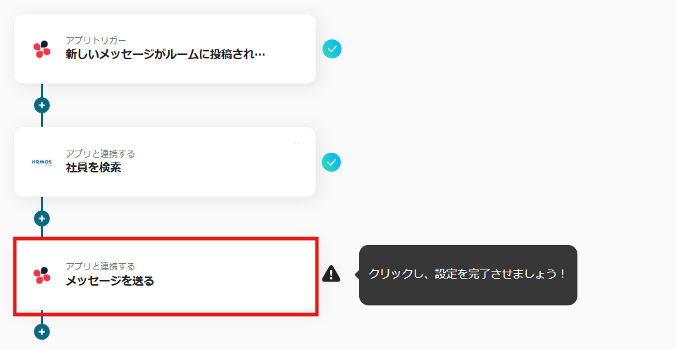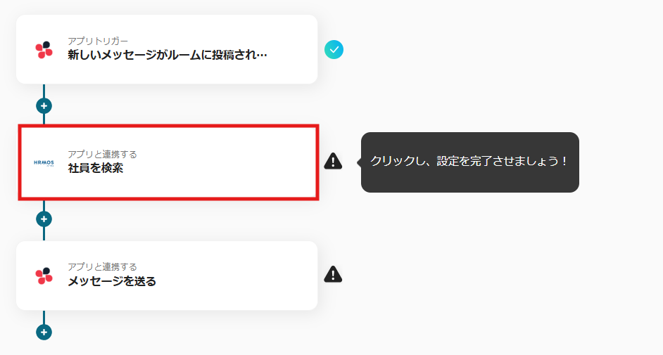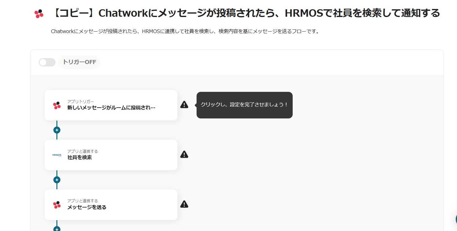 これで【Chatworkにメッセージが投稿されたら、HRMOSで社員を検索して通知する方法】というフローが完成です。