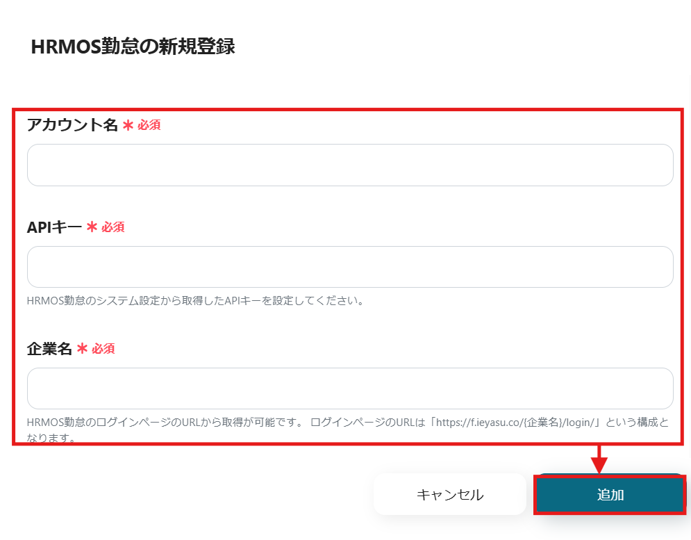 同様にHRMOS勤怠を選択したら、事前準備で取得した情報を基に必要事項を入力し、「追加」をクリックします。
