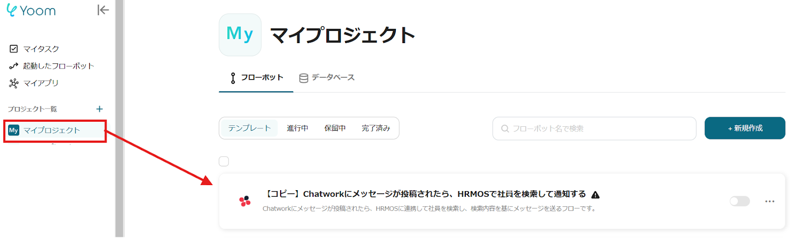 ここからは、Yoomのテンプレート【Chatworkにメッセージが投稿されたら、HRMOSで社員を検索して通知する方法】という連携フローを使って設定の解説をします。