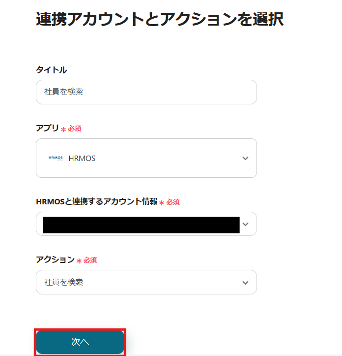 2) アクションは「社員を検索」を選択し、必須項目を入力します。