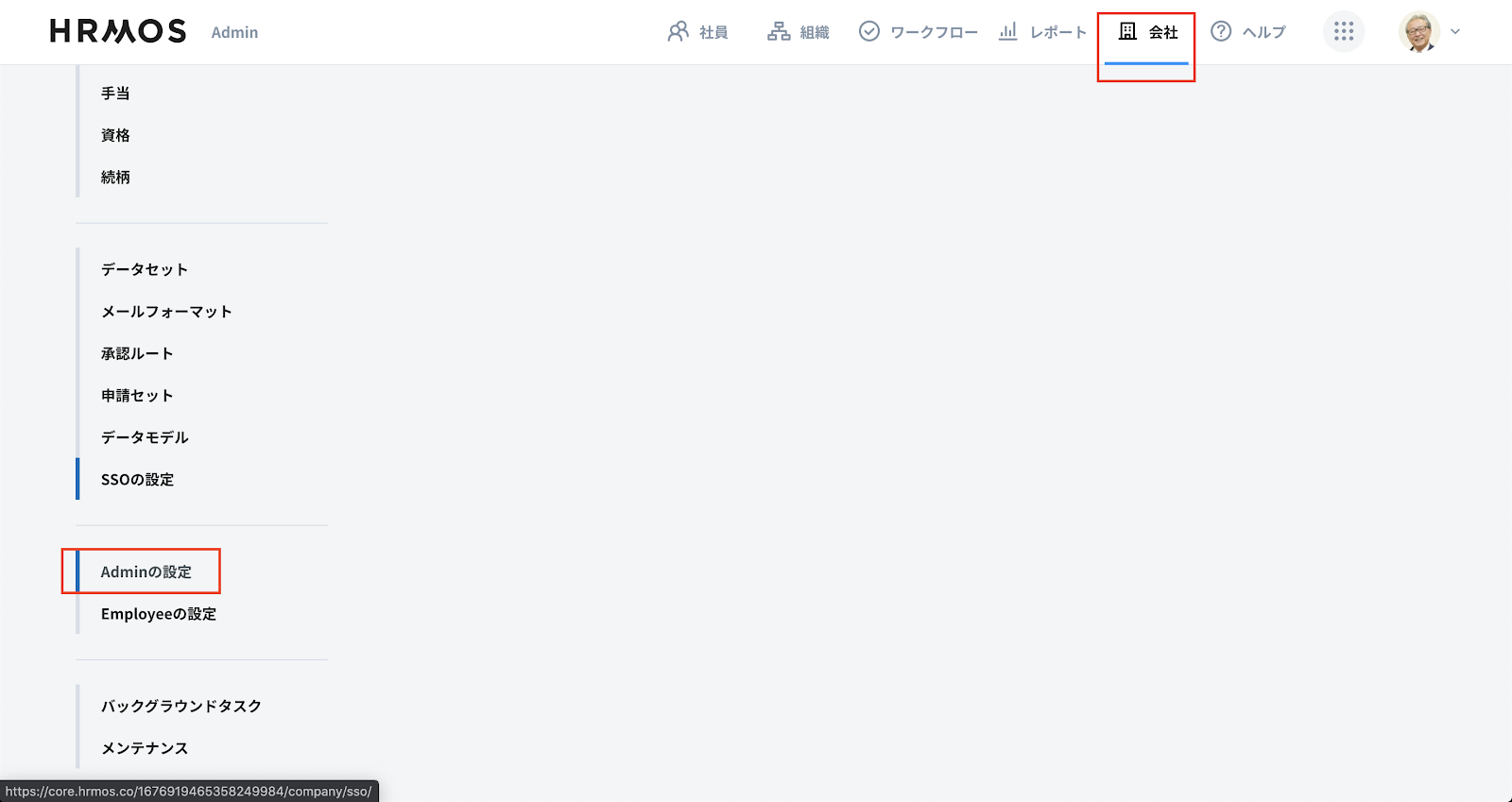 Admin画面で「会社」タブを選択し、サイドメニューの「Adminの設定」を選択します。