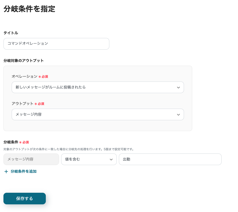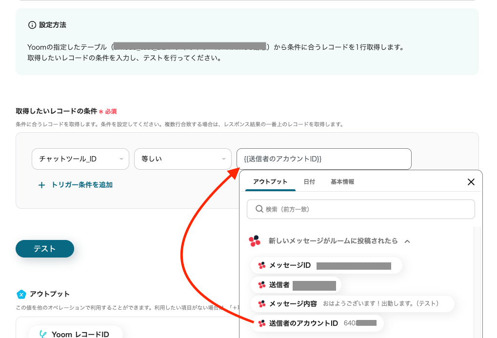 今回は画像のように「データベースに保存されているチャットツールIDとメッセージ送信者のIDが等しい」という条件を設定しました。