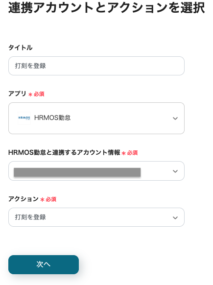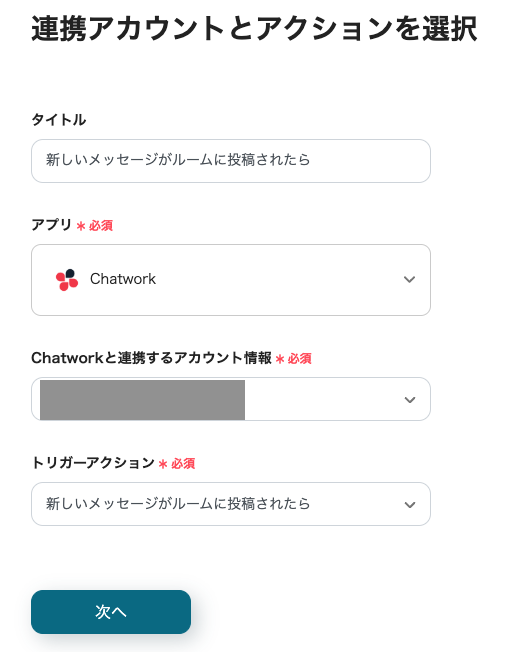 タイトルの任意編集とアカウント情報の確認を行い、アクションは変更せず「次へ」をクリックして先に進みます。