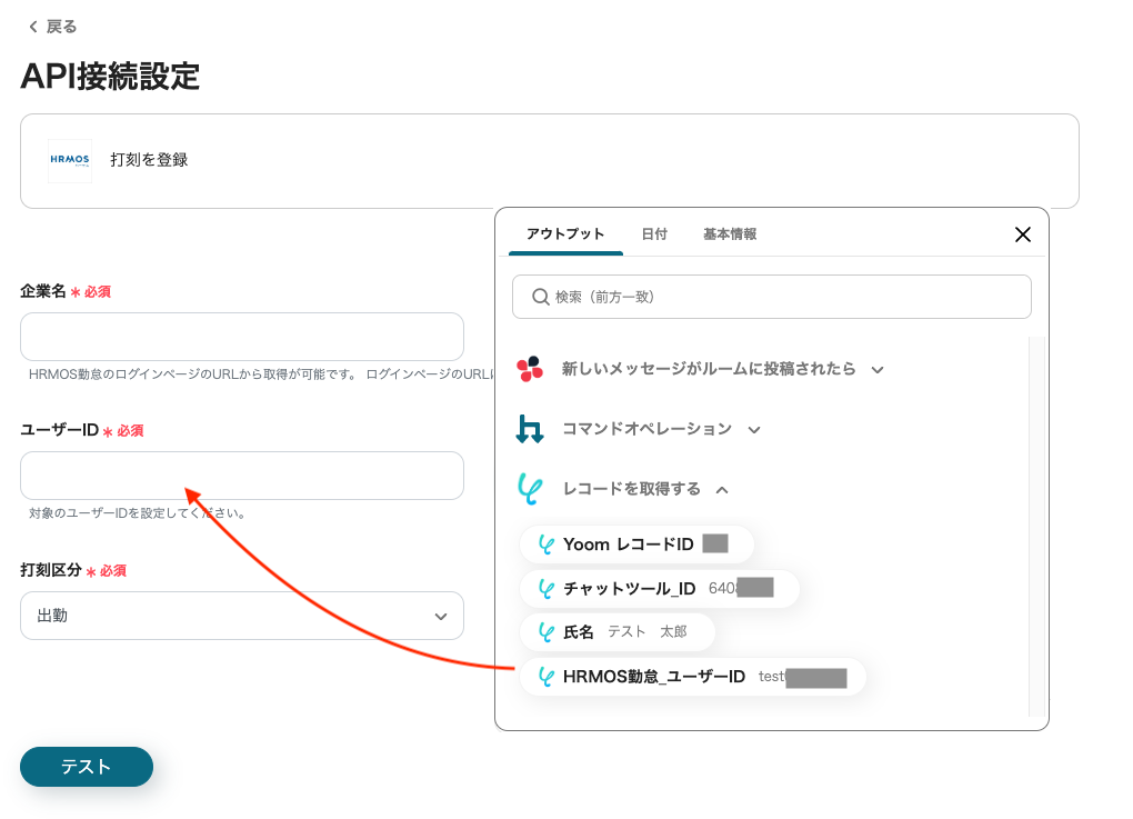 「ユーザーID」は、欄をクリックしてYoomのデータベースから取得したHRMOS勤怠のユーザーIDを選択します。