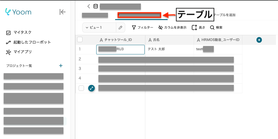 フローを起動する前提として、ChatworkのアカウントIDとHRMOS勤怠のユーザーIDをYoomのデータベースに登録しておく必要があります。