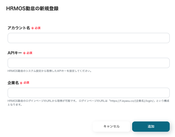 各項目を入力し、「追加」をクリックすると、HRMOS勤怠のマイアプリ連携が完了します。
