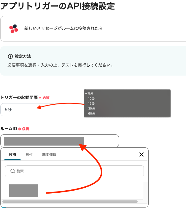 「ルームID」は、欄をクリックすると表示される候補から該当チャンネルを選択するか、ルームURLの「#!rid」以降の数字部分を入力してください。