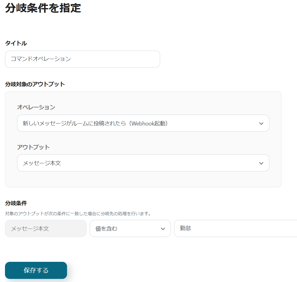 今回は、Chatworkに「勤怠」と投稿されたときに勤怠データを取得して、メッセージを送りたいので分岐条件を以下のように設定します。