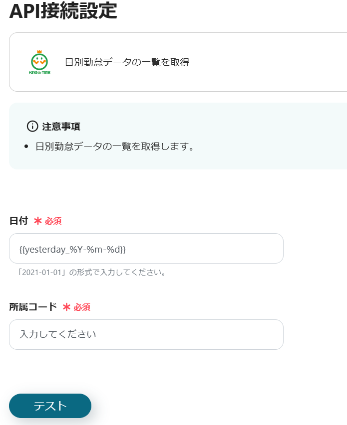 所属コード:KING OF TIMEから選択します。営業所などいくつかの所属コードがある場合は取得したい場所のものを設定してください。