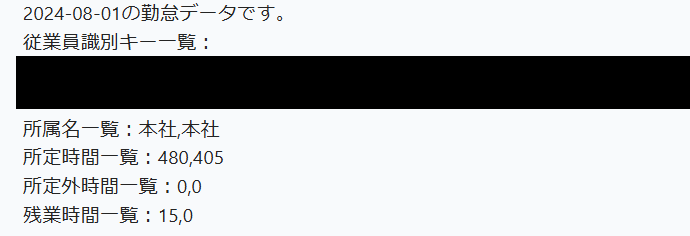 テストでは所属している従業員が2名なので、2名分の勤怠データを取得しました。