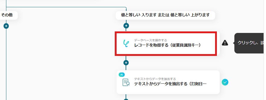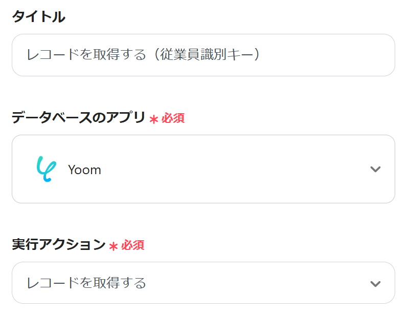 続いて、Yoomの指定したテーブルから条件に合うレコードを1行取得する設定を行うため、「レコードを取得する(従業員識別キー)」をクリックします。