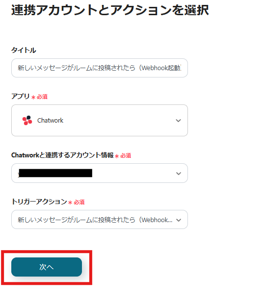 連携アカウントとアクションを選択の画面が表示されるので「次へ」をクリックしましょう。