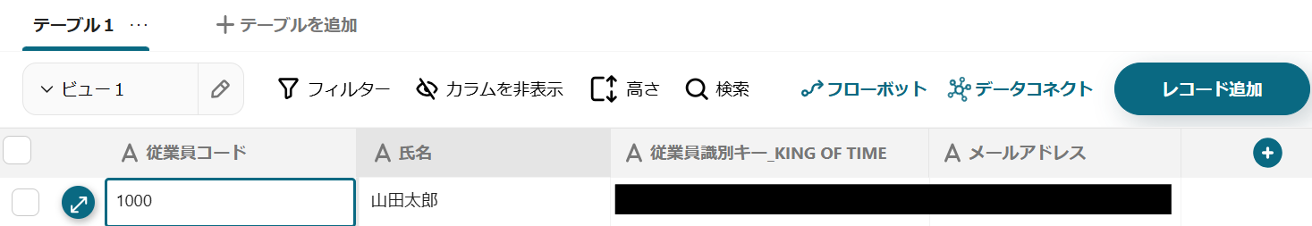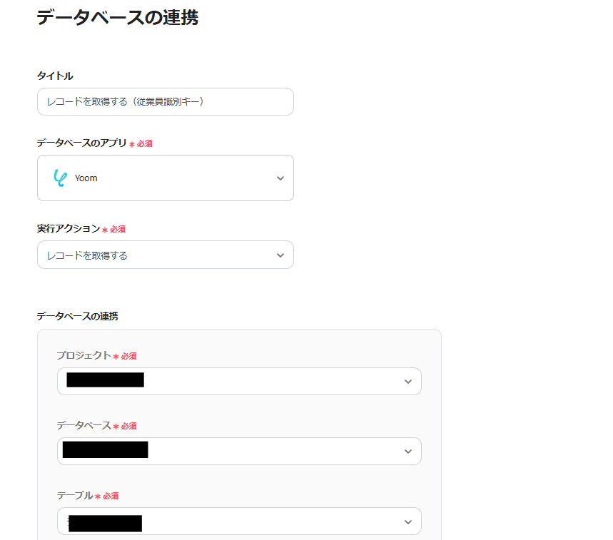 「レコードを取得する(従業員識別キー)」の画面に戻って、「データベースの連携」を設定します。