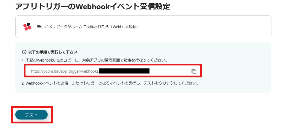 WebhookURLをコピーし、対象アプリの管理画面で設定を行ないましょう。