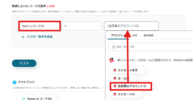 YoomのレコードIDとChatworkのアカウントIDが同じ時に作動するよう入力しましょう。