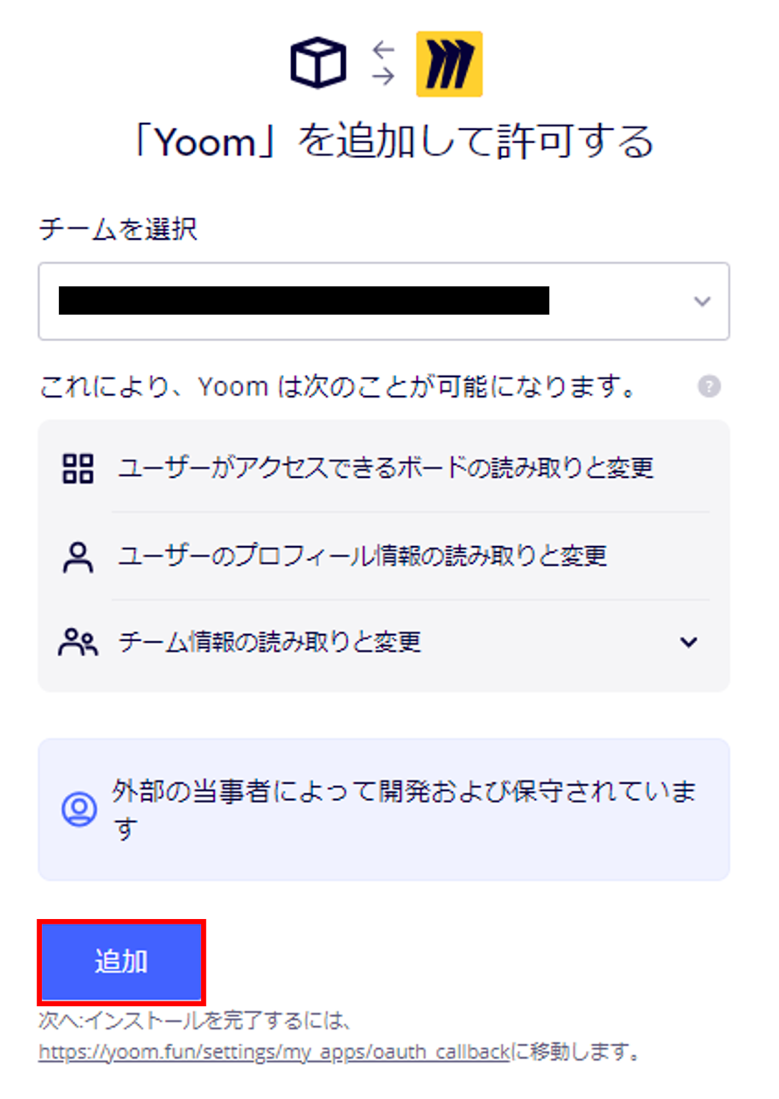 上記の画面が表示されるので、使用したいチームを選択して「追加」をクリックしたら連携完了です。