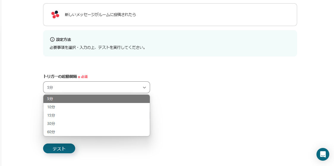 トリガーの起動間隔を、5分/10分/15分/30分/60分から任意で設定してください。