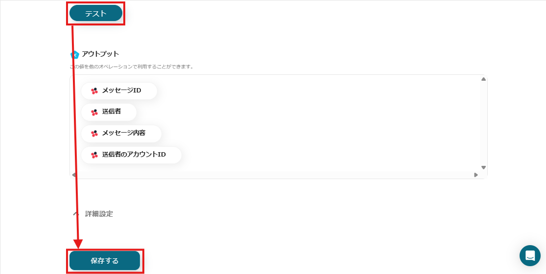 テストをクリックすると、先ほど送信したメッセージの情報がアウトプットに表示されるので「保存する」を選択してください。