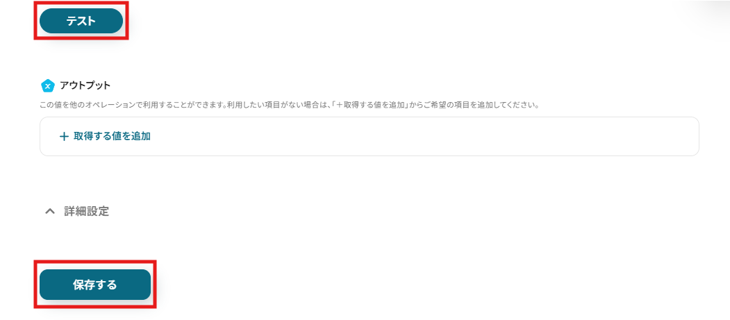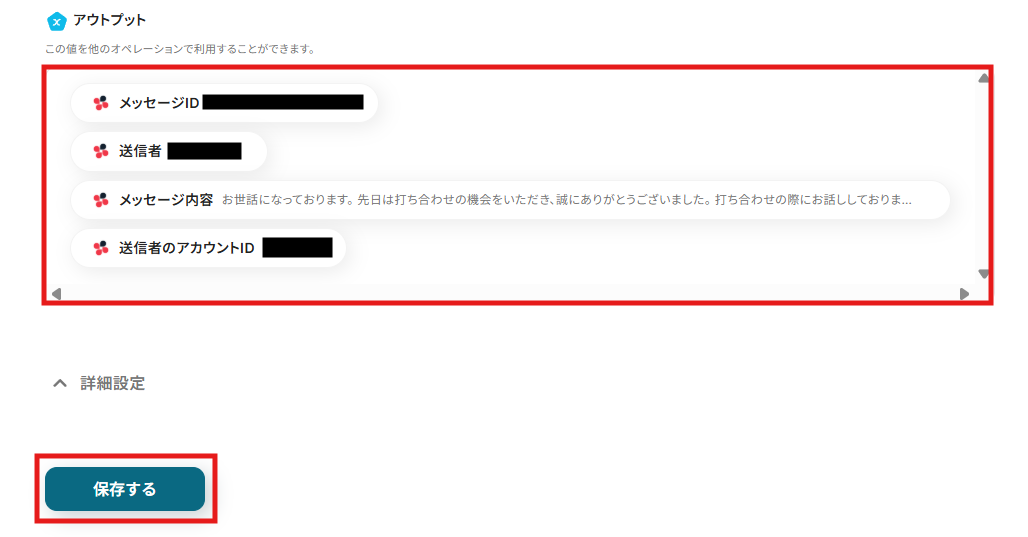 (5)テストを実行し、「アウトプット」ステップ3で投稿されたメッセージの内容から正常に抽出できているか確認します。