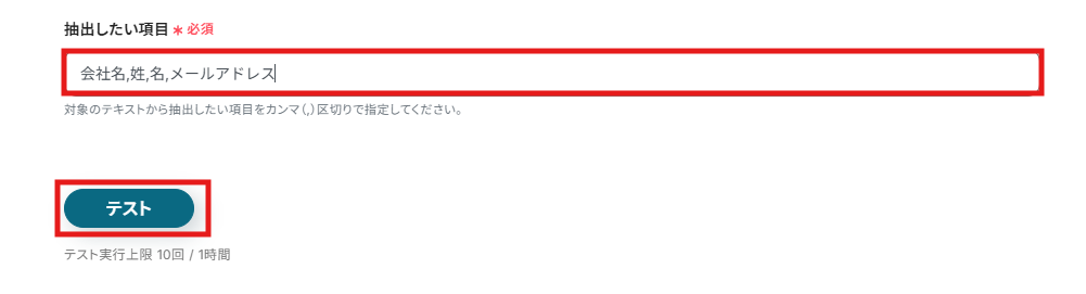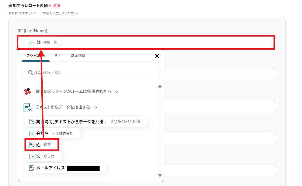 設定したい箇所の入力ボックスをクリックし、「アウトプット」の「テキストからデータを抽出する」から対象の項目を選択することで前の項目で抽出した内容を引用できます。