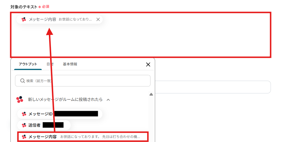 (3)「対象テキスト」にChatworkから抽出したいメールの内容を設定します。