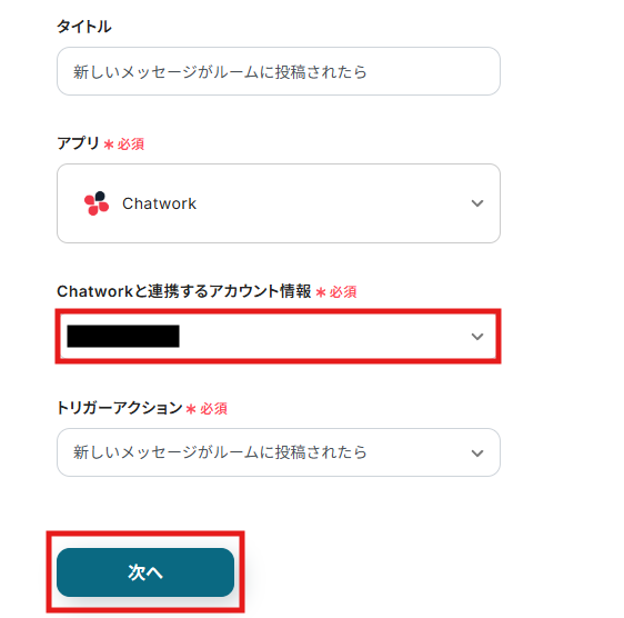 (2)「Chatworkと連携するアカウント情報」に、連携したいChatworkのアカウント情報を選択し、「次へ」をクリックします。