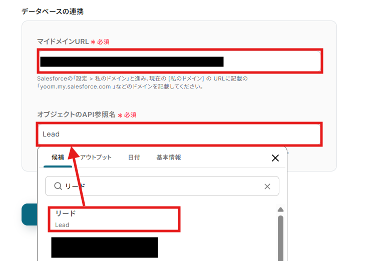 - オブジェクトのAPI参照名:設定からAPIを参照するか、「候補」から「リード」などのAPIを参照し入力