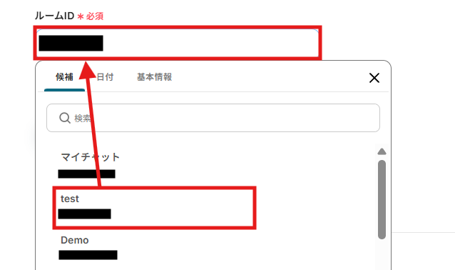 「候補」にアカウント内のルーム一覧が表示されます。適切なルーム名をクリックすることで、ルームIDを自動で設定できます。