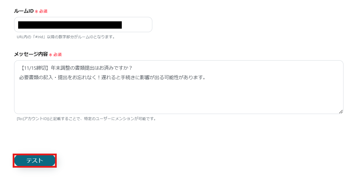 メッセージ内容は、リマインドしたい内容を自由に入力してください。年末調整や請求処理の案内など、自由にメッセージを作成して送れます。