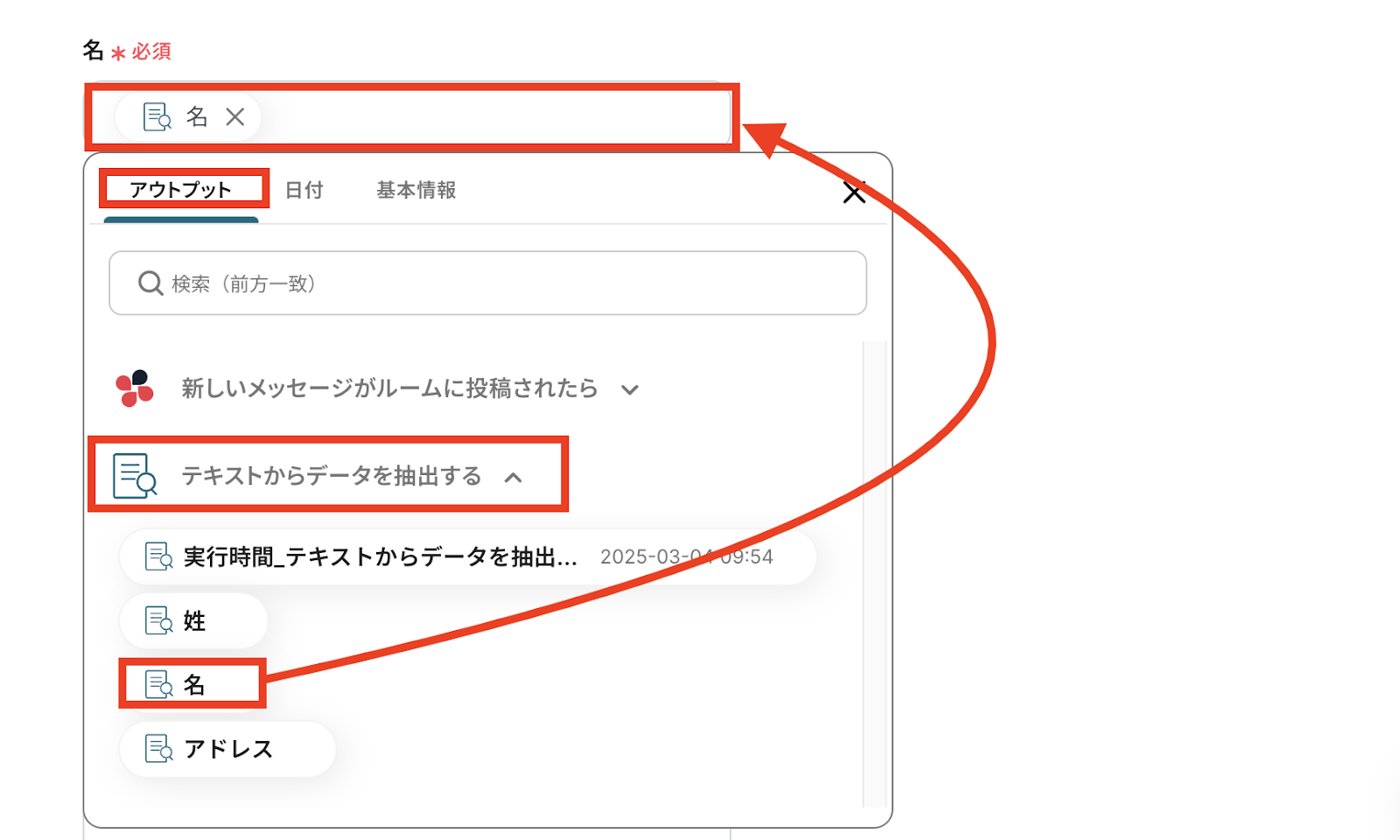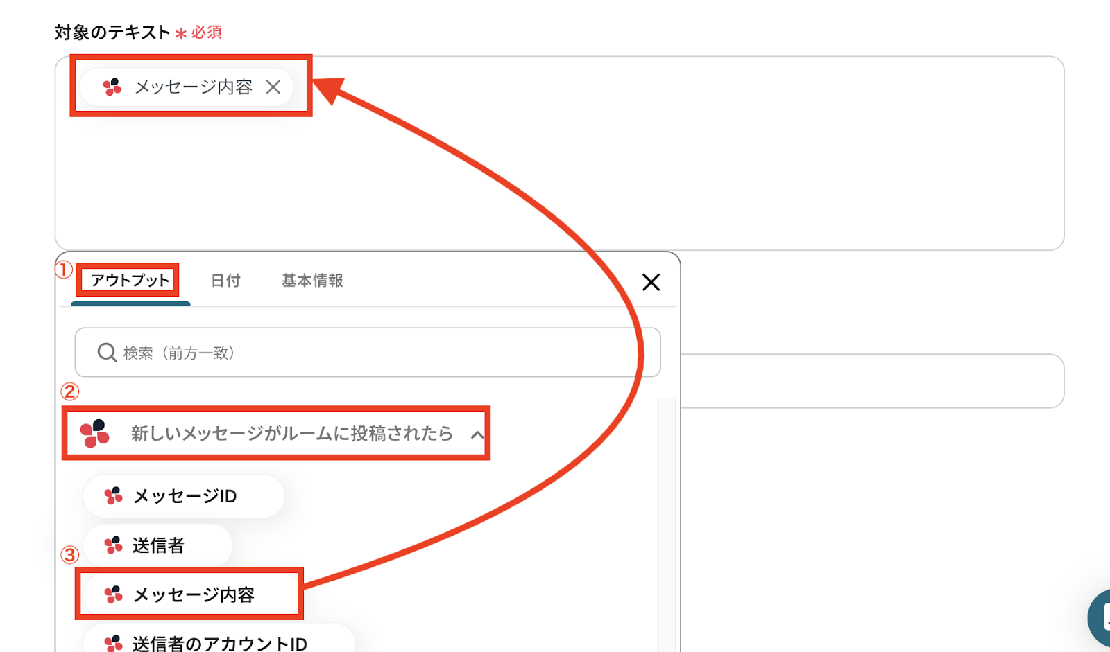 今回はChatworkに投稿されたメッセージ内容から抽出するため「メッセージ内容」と入力します。