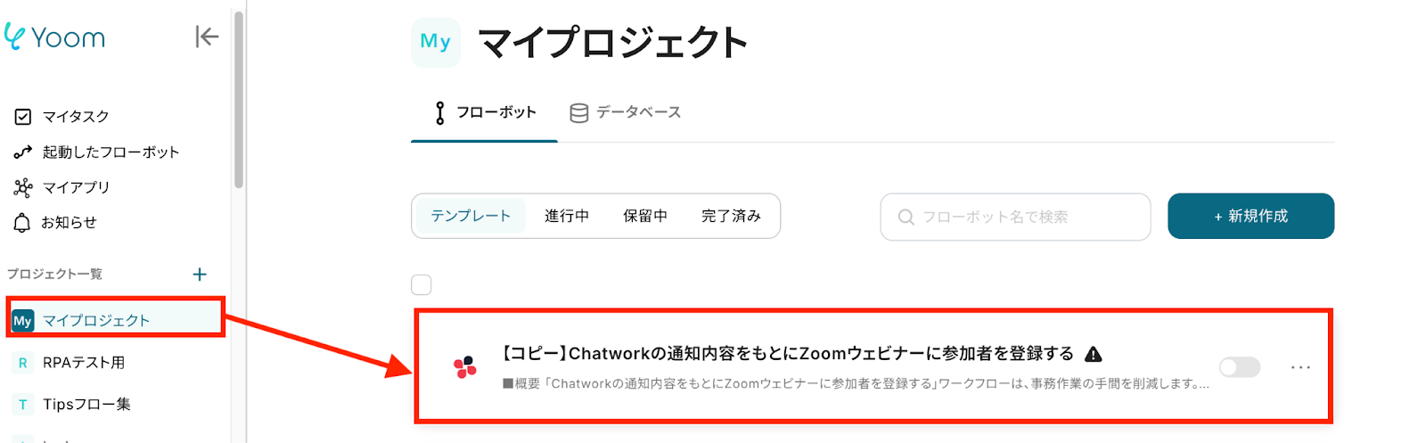 左側にあるメニューの「マイプロジェクト」から、コピーしたテンプレートを開きます。
