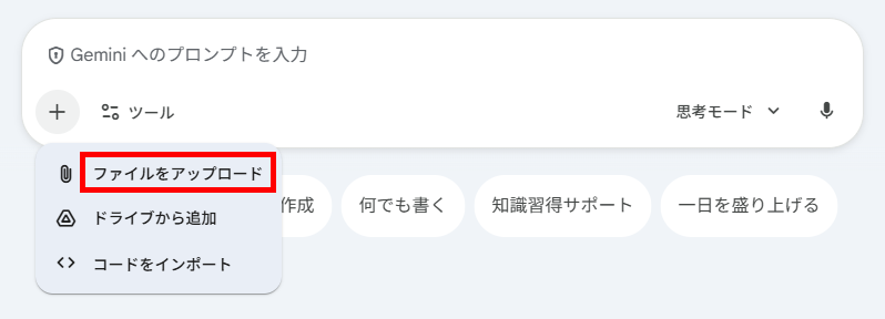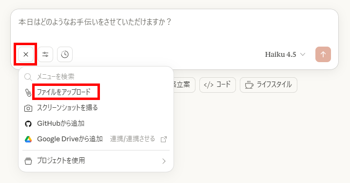 「+」マークをクリックし、「ファイルをアップロード」から準備したファイルを添付します。