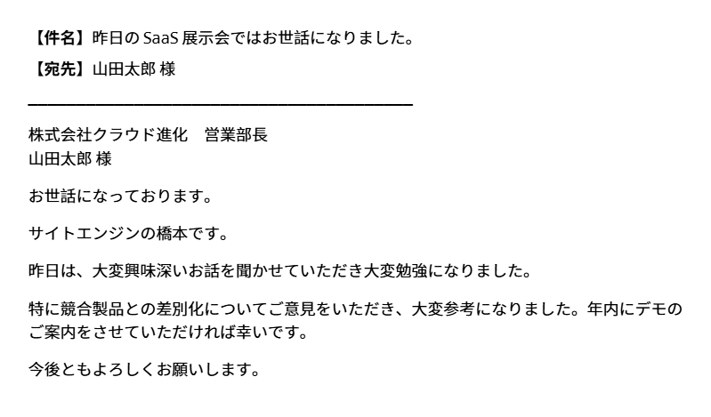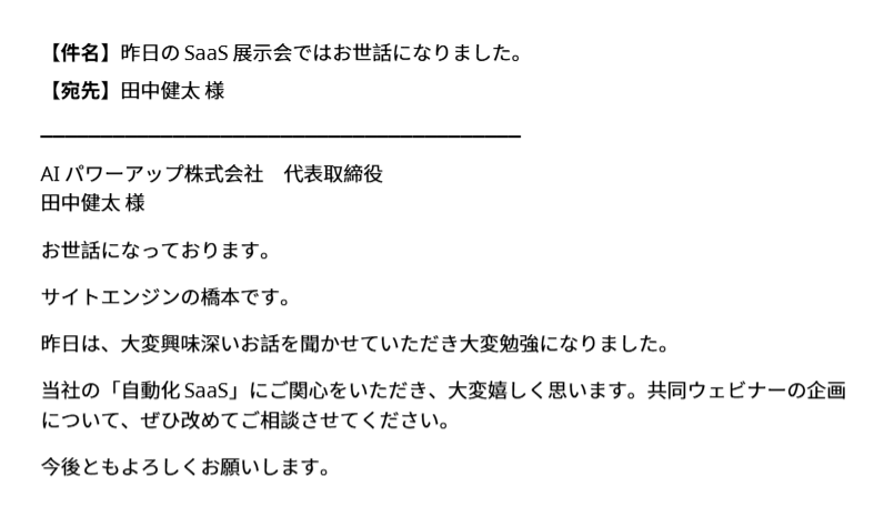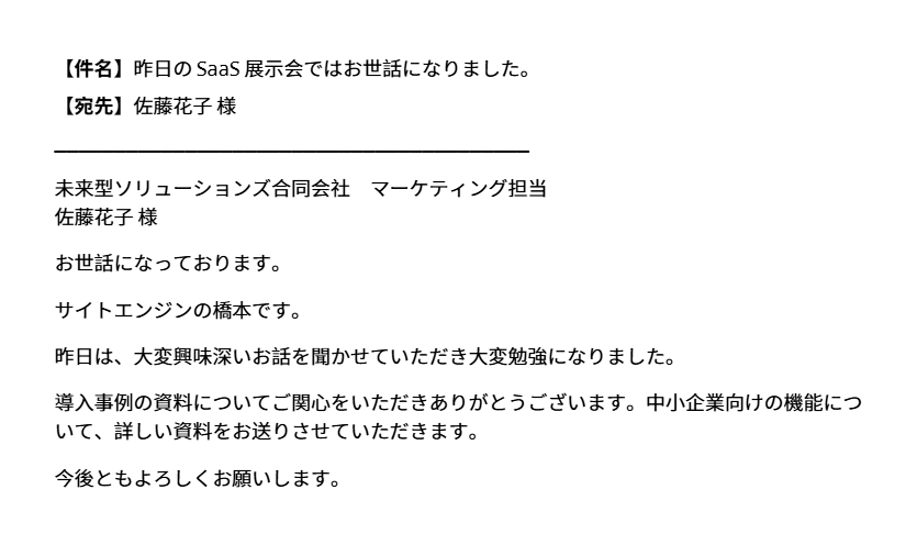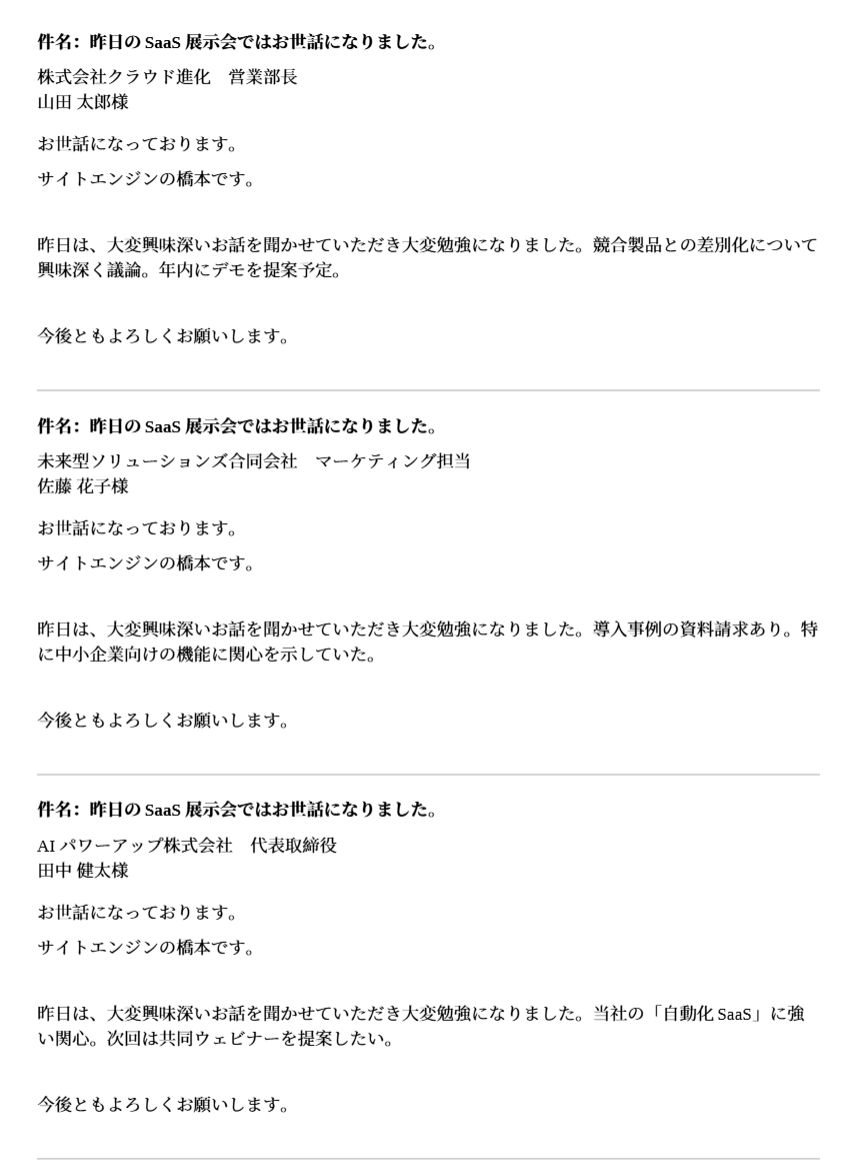 イベントの熱気が冷めやらぬ中、デスクに積まれた名刺の山…。一枚一枚に可能性を感じつつも、それぞれの文脈に合わせたフォローアップメールを送るという、時間のかかる現実に直面していませんか?