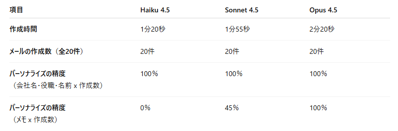 今回の検証で、大量のリストを高品質かつ安定して処理するというメール自動化のニーズに最も応えられたのはClaude Opus 4.5でした。