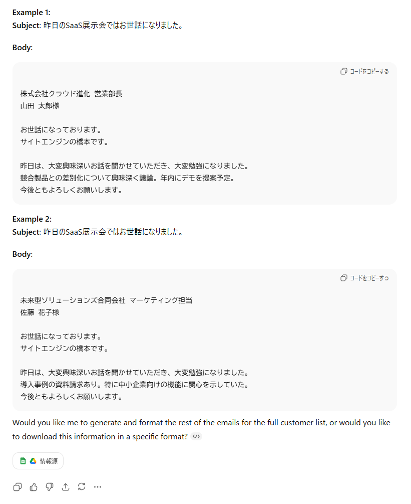 求めるアウトプット:リストに基づきパーソナライズ要素を反映した複数の営業フォローアップメールの作成