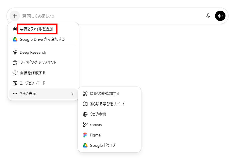 「+」マークをクリックして「写真とファイルを追加」を選択し、ファイルを添付します。