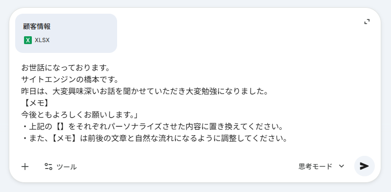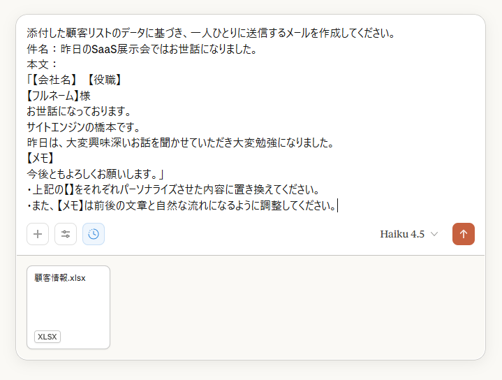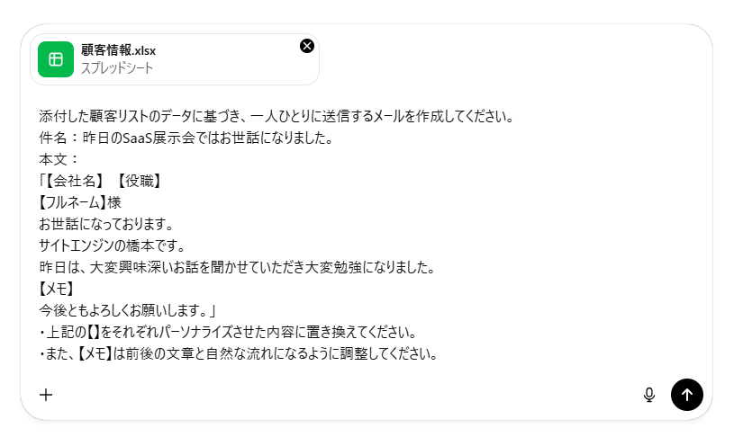 添付した顧客リストのデータに基づき、一人ひとりに送信するメールを作成してください。