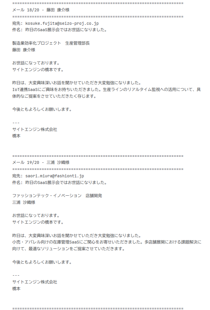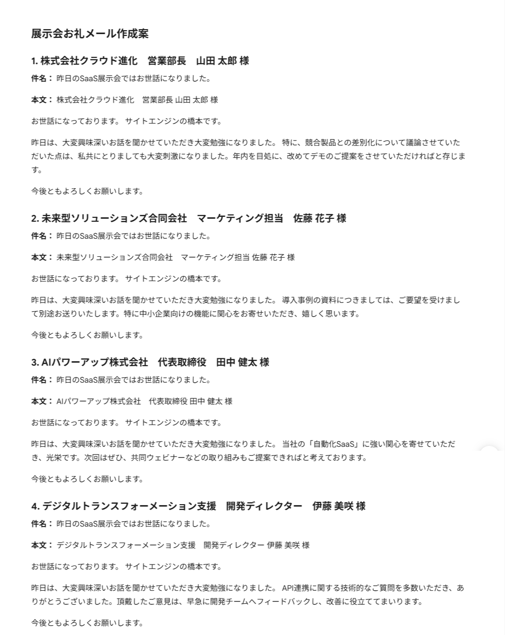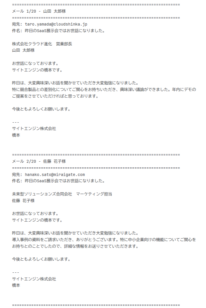数分の待ち時間で、修正不要なレベルのメールが20通完成する体験は、一度味わうと手放せなくなるはずです。