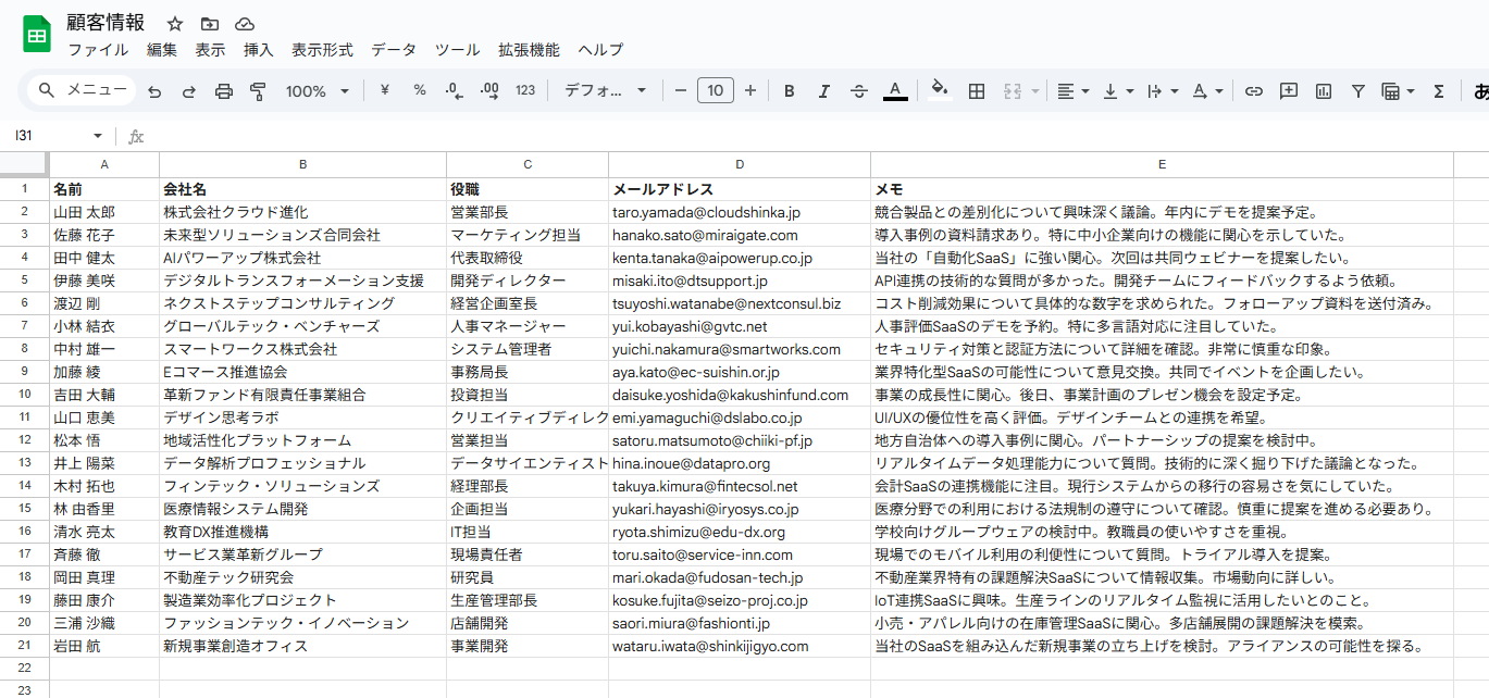 SaaS展示会で20名の方と名刺交換をしたシーンを想定して、以下の顧客リストを用意しました。