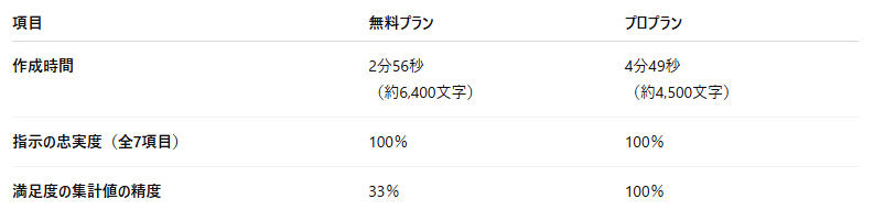 しかし、有料プランが指示通り正確に3項目の満足度を計算したのに対し、無料プランの精度はわずか33%(1項目)にとどまりました。