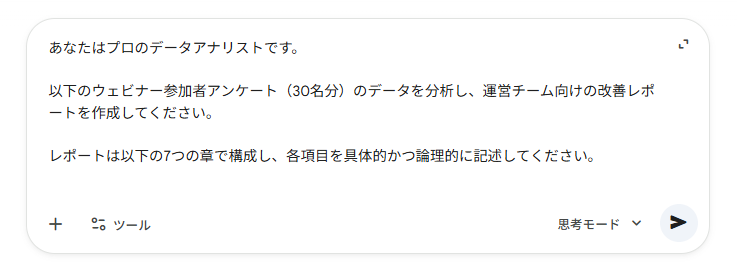 求めるアウトプット:30件のウェビナーアンケート回答を分析し、要望傾向の把握および上司報告用レポートの作成