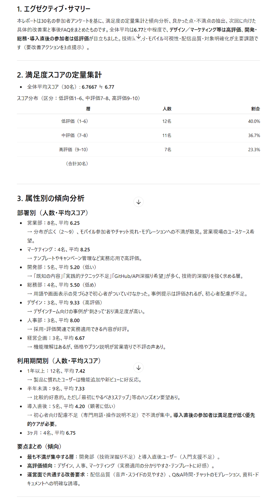 以下のウェビナー参加者アンケート(30名分)のデータを分析し、運営チーム向けの改善レポートを作成してください。