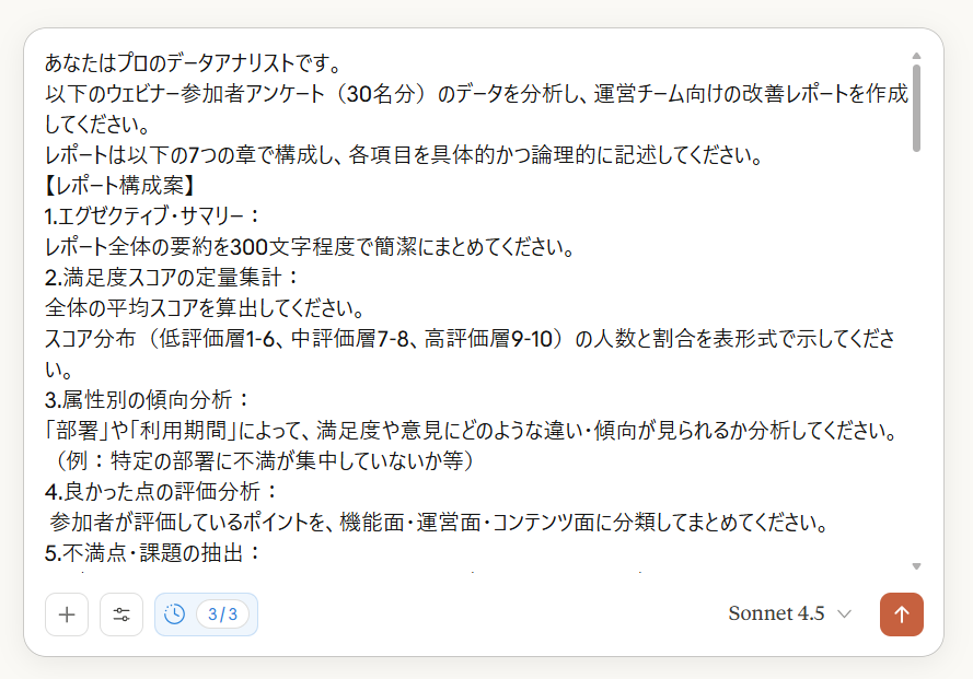 今回は、ウェビナーのアンケートを分析する状況を想定し、Claudeの無料プランと有料プラン、そしてGeminiとChatGPTの無料プランで作成したレポートを比較検証しました。