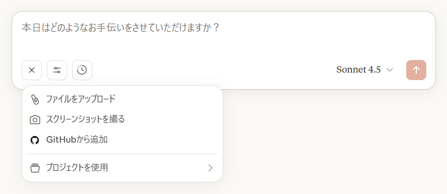 ファイルの添付やリサーチ範囲の設定は、「+」マークから可能です。