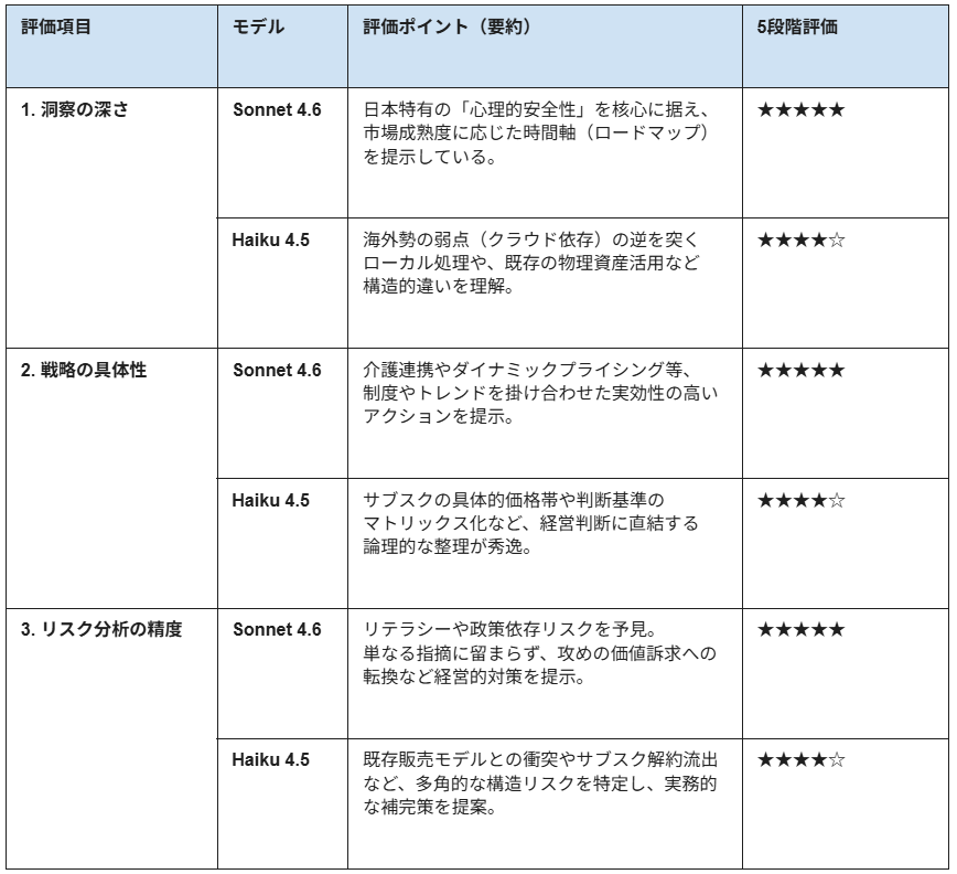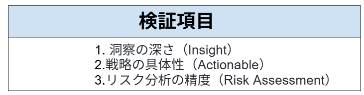 本検証は、AIモデルを「戦略立案のパートナー」として活用する際の実用性を明らかにすることを目的としており、与えられた市場データから単なる要約を超えた「勝てるロジック」を構築できるかという思考の深さを測定するとともに、企業の意思決定者がそのまま検討の土台に載せられるレベルの「具体的アクション」を提示できるかという実効性を確認し、さらにビジネス上の障壁を予見して現実的な「回避策」を提示できる多角的なリスク管理のバランス感覚までを総合的に評価します。