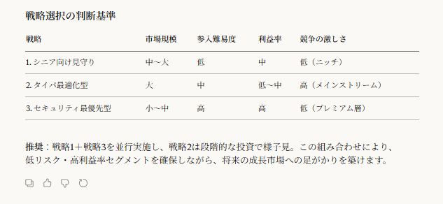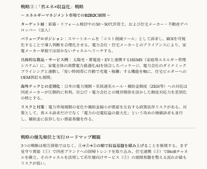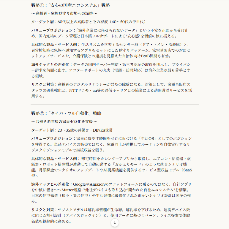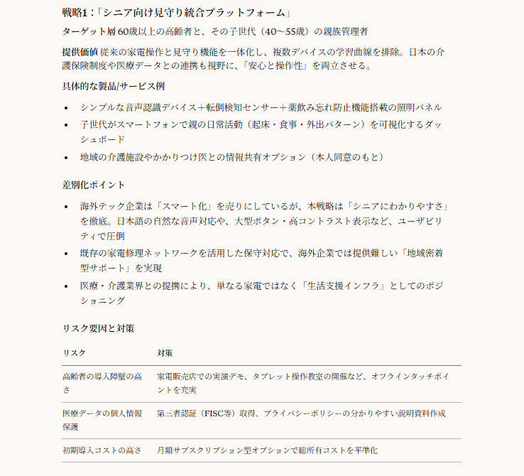 1. それぞれの戦略に「ターゲット層」「提供価値(バリュープロポジション)」「具体的な製品/サービス例」を含めること。