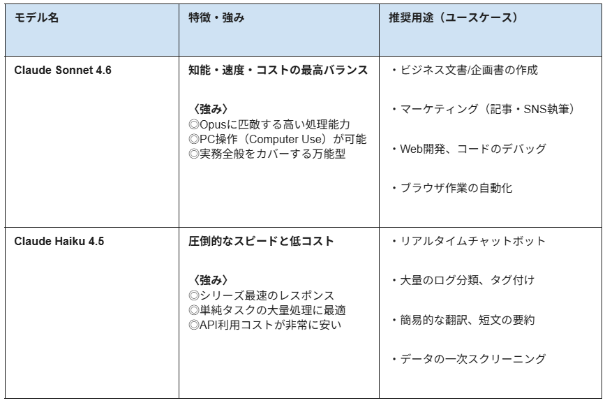 ここでは、Sonnet 4.6とHaiku 4.5について、それぞれの特徴や推奨用途を深掘りして比較します。表でもまとめているので、ぜひ参考にしてみてくださいね!