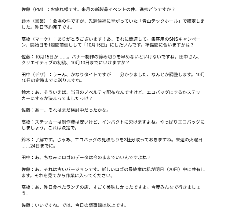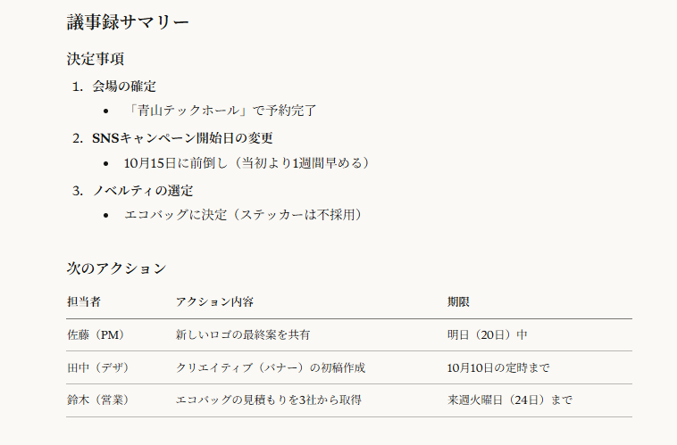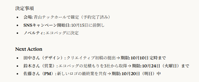 必要十分な抽出 : 「会場」「SNS開始日」「ノベルティ」という3つの決定事項、および3名の担当者によるネクストアクションが漏れなく抽出されています。
