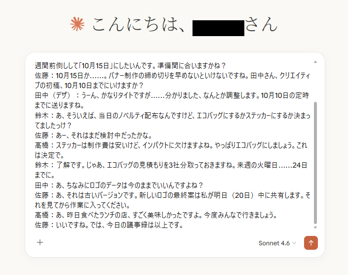 🤔プロンプトの書き方を工夫して、Claudeを検証! ここでは、実際にClaudeを使って、プロンプトの書き方一つで出力結果がどれほど変わるのかを検証してみます。 検証のテーマは「議事録からの情報抽出」です。架空の会議テキストを読み込ませ、そこから「決定事項」と「ネクストアクション」を抜き出すタスクを行います。